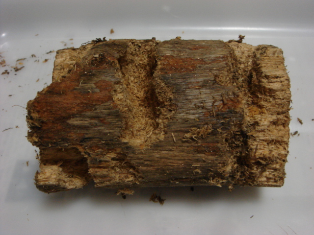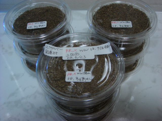 【学名】Dorcus Hopei Binodulosus 【血統】♂真紅の赤【紅】(RR)66mm06年4月下旬羽化 ♀岡山産 (WW)45mm07年7月上旬羽化 【産地】岡山県 【累代】CB ◇セット日 6月23日~7月18日(2回目) ◇割出し日 8月 4日 それでは、本日3セット目の解体作業開始!材の状態確認。悪くは無い今回は、いつものカワラ材ではなく、ニクスバーを使用してみました。材が細ければ、幼虫頭数もそれなりなのか?実験です。只、このニクスバー材での館記録は1本で43頭の幼虫を取った実績があるので再度使用してみました。それでは開始→→ ありゃりゃ~、これだけの範囲で1頭だけとわ(?_?) こりゃ、幼虫数も多くは無い感じですね。さて先に進みます。メシッ~メシッ~やはりこんなもんか^~。 結果発表:初令7頭 2令2頭。やや少なめの結果となりました。 さて、3セット割り出し開始から2時間強を経過、眠た過ぎるのでソファーでバタン休。1秒で寝ました。それでは、また(=^ー^)ノ彡